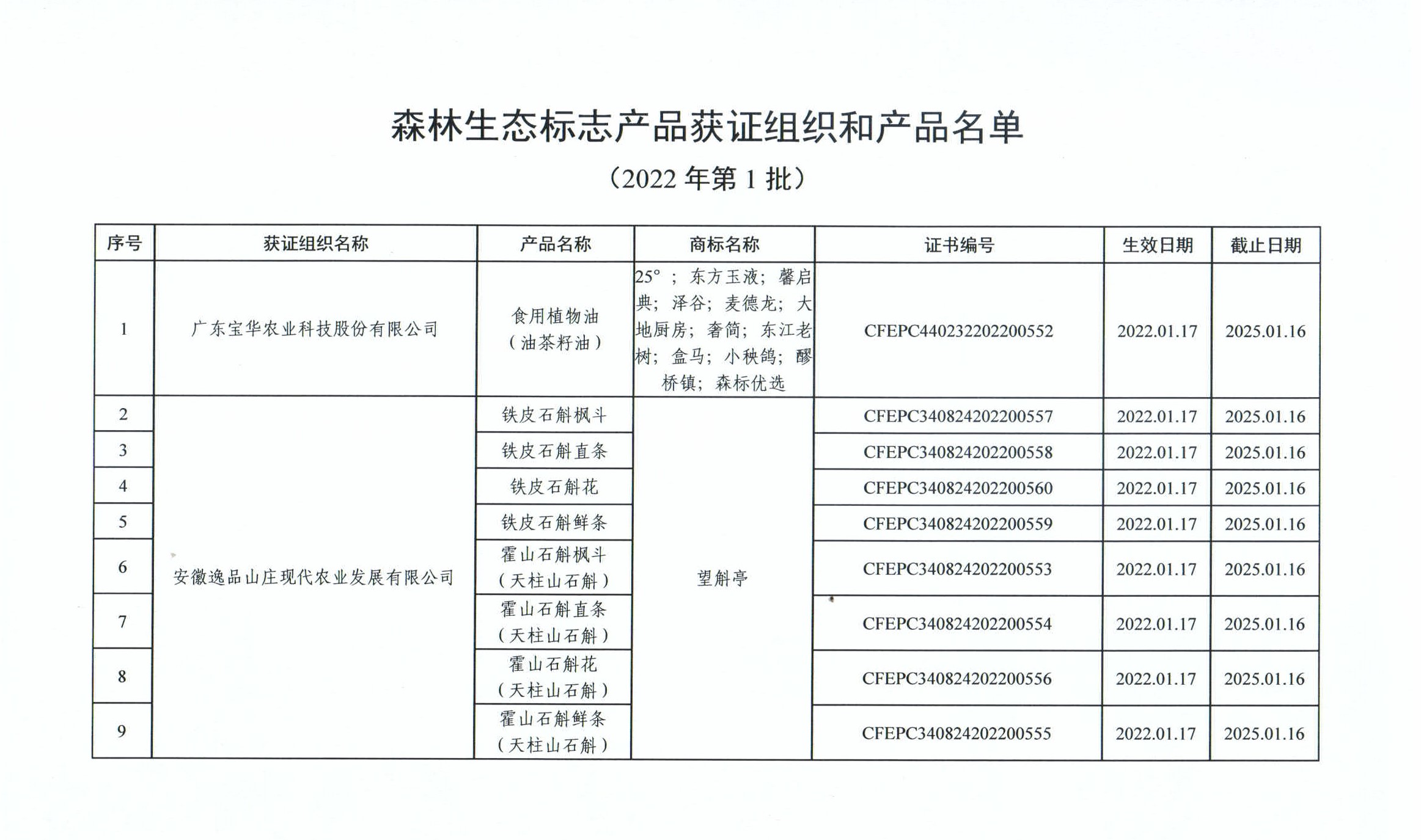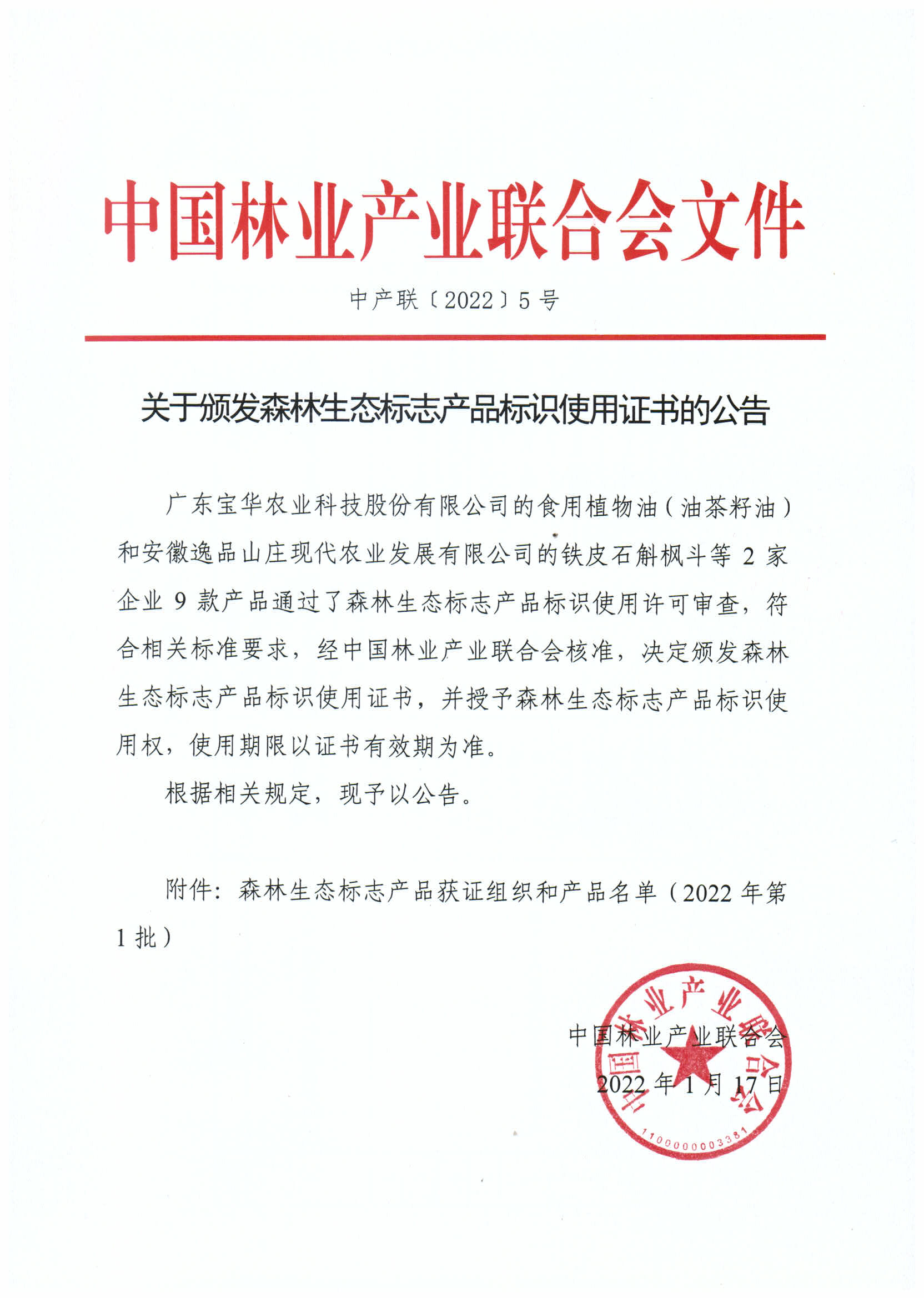 关于颁发森林生态标志产品标识使用证书的公告([2022]5号)